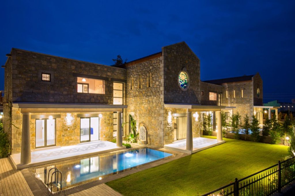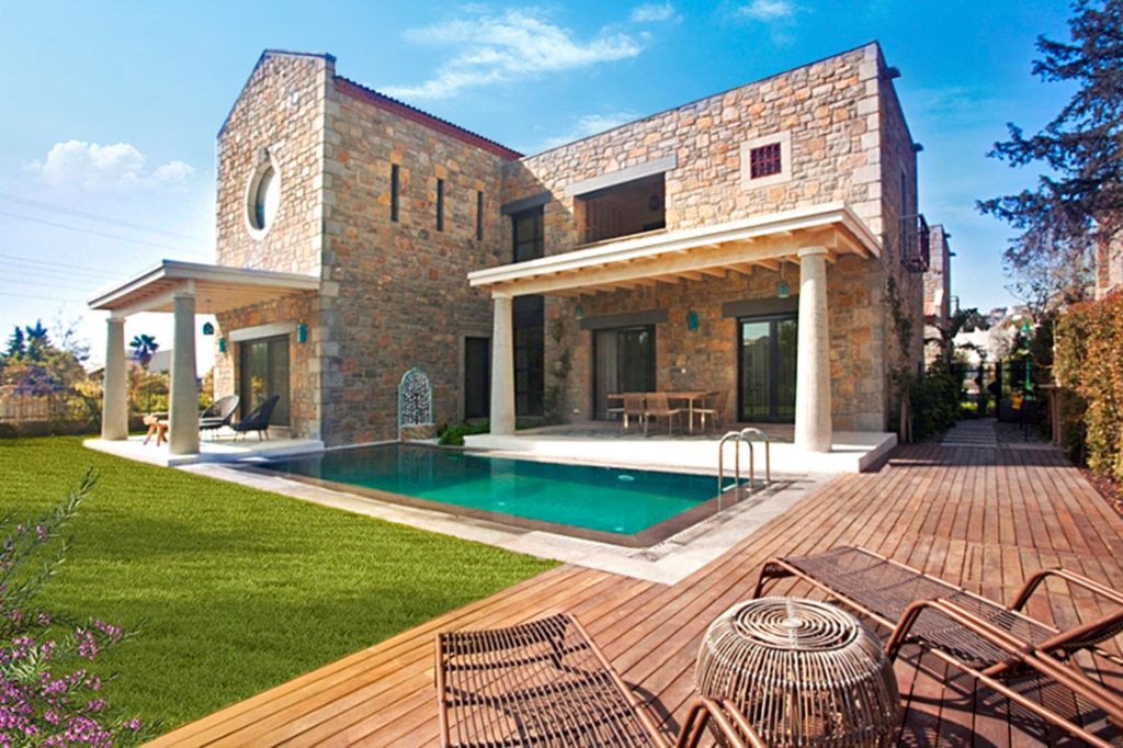 Yöresel mimari ve doğanın uyumu içinde, her detayı incelikle planlanmış tonozlu taş evde, salon bölümündeki yüksek tonoz tavan, üst kattaki yatak odalarına ulaşımı sağlayan ve ahşapla tamamlanmış çelik merdiven ve köprü detayı, sıcak dövme tekniği ile yapılan özel tasarım ferforje Fransız balkonlar ve derin pencereler Ege’ye özgü otantik tarzın izlerini taşıyor.